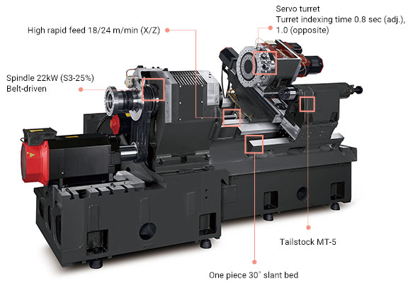 Несмотря на свою быстроту и производительность, новый горизонтальный токарный станок Vturn-S26 обладает высоким КПД шпинделя 22kW с 574Nm, что позволяет производить резание на тяжелых режимах при самых требовательных режимах и материалах. По сравнению с предыдущей версией станка наибольший диаметр над станиной модели Vturn–S26 увеличен и составляет 600mm, что в свою очередь увеличило максимальный диаметр точения с 410 до 430mm.