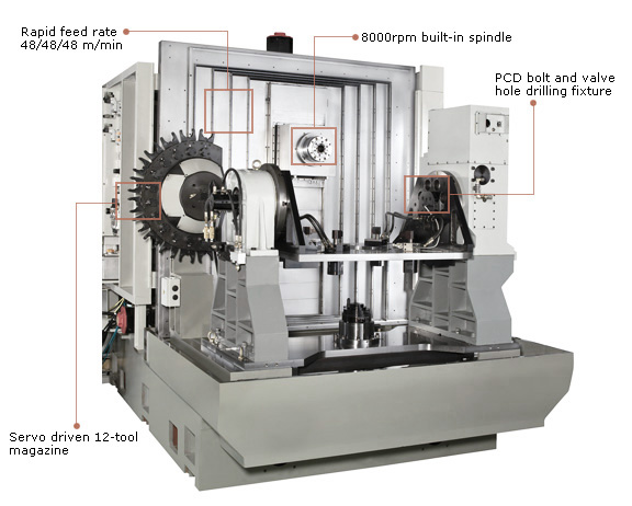 Вследствие возросшей потребности в обратном растачивании отверстия для вентиля колесного диска был разработан станок Vcenter-H26W, который удовлетворяет потребность производителей колесных дисков ОЕМ в обработке колесных дисков размеров 13"~ 26".