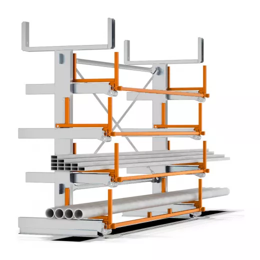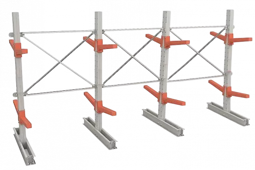 Конструкция стеллажа включает перфорированные стойки, на которых крепятся горизонтальные кронштейны для длинномерных грузов. Специальный инструмент обеспечивает возможность перемещения товаров даже на полках. Доступны также Т-образные стойки для хранения с двух сторон и Г-образные, которые можно приставить к стене. Высота конструкции обычно не превышает 4 метров, а устойчивость поддерживается раскосной системой с натяжителями и болтовыми соединениями. Для дополнительной надежности стеллажи крепятся к полу с помощью анкеров с расстоянием от 1 до 3 метров, в зависимости от нагрузки на опоры.