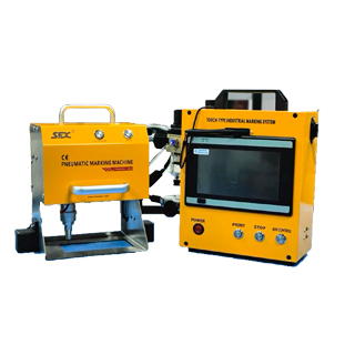- Преимущества этой пневматической маркировочной машины по металлу включают в себя наличие встроенного 7-дюймового контроллера с сенсорным экраном, который активируется при подключении к источнику воздуха и питания.